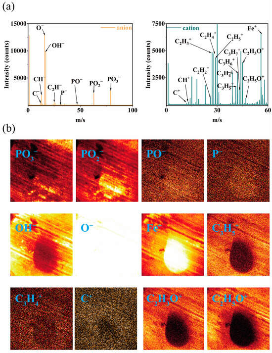 The Time-of-Flight Secondary Ion Mass Spectrometry (TOF-SIMS) is one of the most powerful tools for characterizing the chemical composition of friction films formed during frictional reactions [43,44]. Figure 7. depicts the characterization of the friction film formed on the location of the worn spot on steel balls after conducting a 30 min friction test (392 N, 1200 r/min) with HFC-PA-4 containing 4 wt% PA, using TOF-SIMS. Figure 7a illustrates the anion and cation spectra of the friction film, with the x-axis representing the mass-to-charge ratio, where different ratios represent different ion fragments. In the anion spectrum, characteristic peaks of phosphorus-containing ion fragments, such as P−, PO−, PO2−, and PO3−, are detected, indicating the involvement of phytic acid in the frictional chemical reaction on the surface of GCr15 steel balls. In the cation spectrum, Fe+ is detected, suggesting its association with P (P−, PO−, PO2−, PO3−) on the friction surface, which is closely related to the formation of the lubricating film. A significant amount of carbon–hydrogen ion fragments (CxHy+) is observed in the cation spectrum, which may originate from the decomposition of phytic acid and other components in HFC-PA-4. Figure 7b displays the two-dimensional TOF-SIMS image of the lubricating film on the worn spot within the 150 μm × 150 μm range, showing both anions and cations (P−, PO−, PO2−, PO3−, OH−, O−, Fe+, CxHyO+, CxHy+). The high intensity of anions (PO3−, PO2, PO−, Fe+) suggests the chemical reaction between the phosphate groups in phytic acid and the steel ball surface, proving the occurrence of frictional chemical reactions involving phytic acid during friction. It is speculated that this might be one of the reasons for the significant increase in the thickness of the TEM friction film, indicating that the addition of phytic acid facilitates the formation of the lubricating film [45,46].