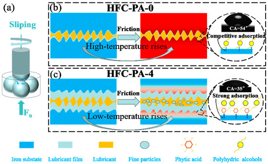 As previously mentioned, the hydraulic fluid (HFC-PA-4), with the addition of phytic acid solution, forms a lubricating film with a thickness of up to 400 nm during the friction process (Figure 4), which far exceeds the thickness of the lubricating film formed by the hydraulic fluid without phytic acid (HFC-PA-0). This is due to the strong adsorption effect of the phosphate groups in phytic acid on metal24. We have also verified this point; from Figure 9, it can be observed that the contact angle of the HFC-PA-4 solution with phytic acid on a steel plate of the same material as the steel ball is 35°, which is significantly smaller than the contact angle of 54° for the HFC-PA-0 solution without phytic acid. A lower contact angle indicates a stronger affinity, which is the reason why the lubricating film formed by (HFC-PA-4) can reach a thickness of 400 nm. During the friction process, a very thick lubricating film effectively prevents direct contact between the rough peaks, reducing the contact area and thereby enhancing the lubricating performance and lowering the coefficient of friction (Figure 9c). As the friction reaction proceeds, part of the friction film is transformed into fine particles with a height of about 300 nm through a friction chemical reaction process. These fine particles further reduce the contact area and enhance the load-bearing capacity, through their combined effects, a significant enhancement in lubricating performance was achieved.