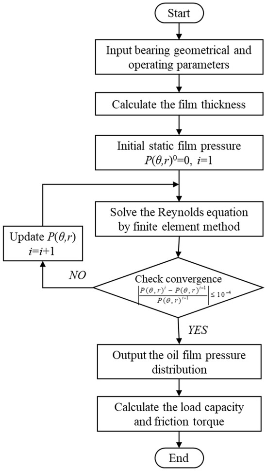 A program is developed for the calculation of the oil-lubricated thrust bearing, as shown in Figure 2. The film thickness (Equation (2)) is first calculated with the given bearing geometrical and operating parameters. Then, based on the finite element method, the oil film pressure is obtained by solving the Reynolds equation (Equation (1)) and boundary conditions (Equations (3)–(5)). The iteration continues until the oil film reaches convergence accuracy δ, which is defined by: