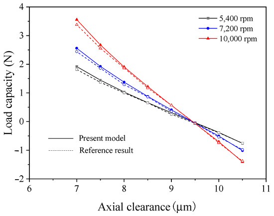 Given the absence of both theoretical and experimental research on the thrust bearings with novel herringbone grooves, this study validates the present model through a comparison with the results on the conventional herringbone groove bearings in the literature [19]. Figure 3 shows the comparison of the load capacities of the thrust bearing under various rotation speeds. As it can be seen, the results of the presented model are in good agreement with those presented in the literature. Thus, the correctness of the mathematical model and the accuracy of the numerical algorithm can be verified.