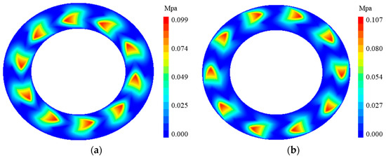 Figure 4 shows the typical film pressure distributions of the thrust bearing under different rotation directions. As shown in Figure 4a, when the bearing rotates counterclockwise, the high-pressure region of the oil film is predominantly located at the inner side. This pressure is primarily generated by the pumping effect of the two inner spiral grooves, with the peak oil film pressure occurring at the interface between the inner and middle spiral grooves. Conversely, when the bearing rotates clockwise, the oil film pressure is mainly produced by the pumping effect of the two outer spiral grooves, shifting the high-pressure region towards the outer side, with the maximum pressure observed at the boundary between the middle and outer spiral grooves. This pressure distribution aligns with the design objectives of the novel herringbone groove.