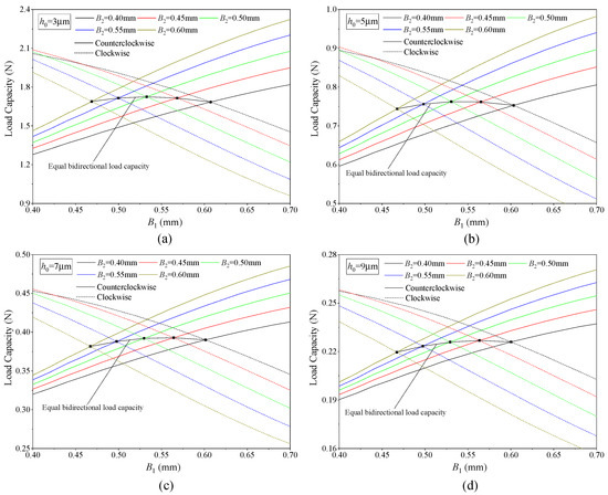 Variation in bearing load capacity with groove radial width: (a) h0 = 3 μm; (b) h0 = 5 μm; (c) h0 = 7 μm; (d) h0 = 9 μm.