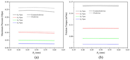 Figure 6 shows the variations in the maximum film pressure and the friction torque of the thrust bearing with groove radial width. In the calculation, the bearing clearance is 5 μm, while the groove widths are B1 = 0.53 mm, B2 = 0.50 mm, and B3 = 0.47 mm. As it can be seen, the bearing load capacity exhibits a slight decrease as B2 increases, whereas the variation in the thrust bearing friction torque remains relatively minor. Additionally, the maximum film pressure and friction torque are both higher during clockwise rotation compared to during counterclockwise rotation. This is primarily due to the fact that, during clockwise rotation, the maximum film pressure occurs at the boundary between the middle and outer grooves, where the radius is larger than that of the corresponding boundary during counterclockwise rotation. Consequently, the dynamic effect is more pronounced, resulting in higher oil film pressure.