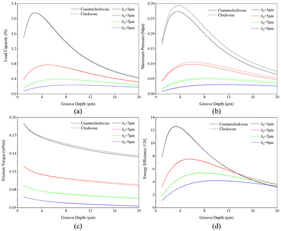 Variation in bearing static characteristics with groove depth: (a) load capacity; (b) maximum pressure; (c) friction torque; (d) energy efficiency.