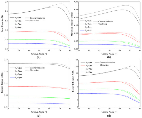 Furthermore, it can also be seen that when the groove angle is less than 50°, the bearing load capacities, when rotating counterclockwise, are almost the same as these when rotating clockwise. When the groove angle is greater than 60°, the bearing load capacities during clockwise rotation are greater than those during counterclockwise rotation. The results show that, as the groove angle is greater than 60°, the bearing performance differences under different rotation directions will increase.