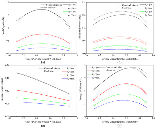 In addition, it can also be seen that when the circumferential width ratio is less than 0.7, the bearing load capacities when rotating counterclockwise are larger than that when rotating clockwise. When the groove circumferential width ratio is larger than 0.7, the bearing load capacities during clockwise rotation are smaller than these during counterclockwise rotation. However, it should be pointed out that the influence of the groove circumferential width ratio on the bearing performance differences under different rotation directions is relatively small.