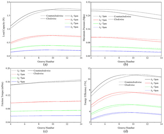 Moreover, when the groove number is fewer than 10, the load capacity and energy efficiency of the bearing when rotating counterclockwise are superior to those observed in clockwise rotation. Conversely, when the groove number is larger than 10, both the load capacity and energy efficiency when rotating counterclockwise are lower than those when rotating clockwise.