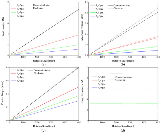 Furthermore, the load capacity and energy efficiency of the bearing in anticlockwise rotation and clockwise rotation are almost the same, indicating that the groove depth does not affect the difference in bearing performance under different rotation directions.