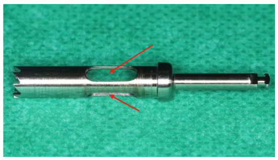 The endodontic bone trephine used in this study [19]. The red arrows indicate the openings that allow irrigation fluid to enter the hollow interior of the trephine, facilitating cooling and lubrication.