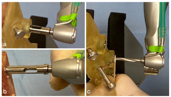 The three study groups were as follows: (a) drilling with a trephine through a surgical guide (guided trephine—GT); (b) freehand drilling with a trephine (freehand trephine—FHT); and (c) drilling with a 2 mm diameter pilot (guided pilot—GP) drill through a surgical guide (Figure 3). The 2.0 mm pilot drill was selected from the implant surgical tray of the SMART Guide System (Dicomlab Dental Ltd., Szeged, Hungary). For group (c), a compatible narrowing sleeve (spoon) was used, as provided by the manufacturer and described in previous studies [23,39].