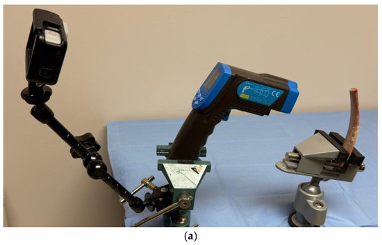 Prior to conducting the measurements, the specimens were warmed to room temperature (20–23 °C). Previous infrared thermographic studies by Augustin et al. demonstrated that the temperature rise during drilling reaches its peak in the cortical layer of the bone [35]. Based on this finding, the experiment was designed to measure the temperature of the bone around the drilled canal just before it penetrates the cortical layer, representing the peak intraosseous heat [8]. Temperature measurements were taken using an infrared thermometric device (HOLDPEAK 880NK, Zhuhai JiDa Huapu instrument Co., Ltd., Zhuhai, China). This device is equipped with two lasers that intersect at the focal point of the infrared measurement, enabling the precise targeting of the drill or trephine exit point (Figure 4a,b).
