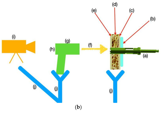 (a) The experimental setting with the bone specimen, thermometer, and camera. (b) The experimental setup: (a) drill/trephine, (b) surgical guide, (c–e) porcine rib bone specimen, (c) cortical layer 1, (d) cancellous bone, (e) cortical layer 2, (f) yellow arrow indicating the direction and focus point of the infrared thermometric measurement, (g) infrared thermometer, (h) thermometer display visible to the video camera, (i) video camera, and (j) adjustable, rotating clamps for specimen fixation.