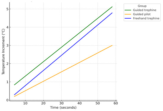 The relationship between drilling time and temperature increase was examined through linear regression analysis, with the results summarized in Figure 7. The regression coefficients (β) quantified the rate of temperature rise per second for each group. In the guided pilot drill group, the temperature increased at a rate of 0.0519 °C per second, indicating a slower and more controlled heat buildup. The freehand trephine group exhibited the steepest rate of temperature rise, with a coefficient of 0.0832 °C per second, reflecting the fastest heat generation. The guided trephine group demonstrated a moderate rate of temperature increase, with a coefficient of 0.0793 °C per second. All regression models were statistically significant (p < 0.05).