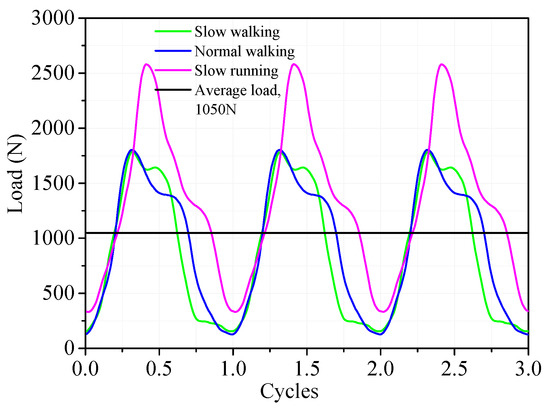 Gait patterns had significant influences on the viscoelastic squeeze-film lubrication of UHMWPE artificial hip joints. Despite the much heavier loads, the minimum film thickness under slow running was much thicker than in normal walking and slow walking cases. It should be noted that the load magnitudes of the slow and normal walking cases were similar, but the loading frequencies were different (0.75 Hz and 1 Hz for the slow and normal walking gaits, respectively). If the frequencies were the same, increasing loads would have a negative effect on the lubrication of UHMWPE artificial hip joints in terms of receding the lubricant film thickness (Figure 11). Therefore, gait frequency played a significant role in the lubrication performance of UHMWPE artificial hip joints, i.e., increasing gait frequency would enhance the lubricant film thickness. This is because with the increase in gait frequency, the normal approach velocity increased, causing an enhancement in the squeeze-film effects. Therefore, the lubrication performance of the UHMWPE hip joint was improved by the increase in gait frequency. Although the heavier loads of the slow running gait might reduce film thickness, the squeeze-film action caused by high frequencies contributed more to the film thickness of UHMWPE artificial hip joints.