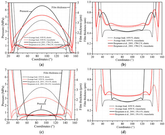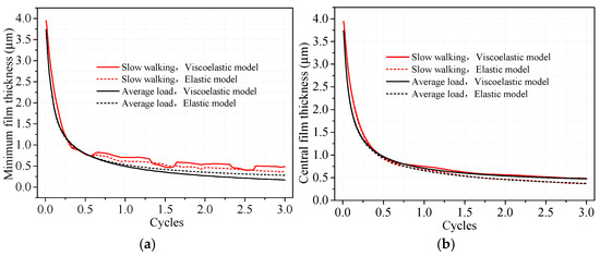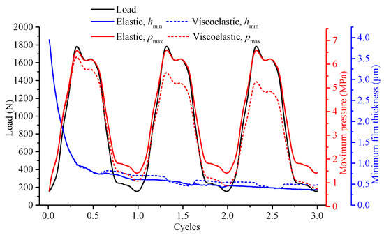 The loads, maximum pressures and minimum film thicknesses under the slow walking condition are shown in Figure 3. The maximum pressures in the elastic model at loading peaks were consistently around 6.58 MPa, corresponding to the peak load of 1784 N. In contrast, the viscoelastic model exhibited maximum pressures of 6.30 MPa, 5.65 MPa, and 5.26 MPa at the three loading peaks. Compared with the elastic model, these values decreased by 4.25%, 14.13% and 20%, respectively, in the viscoelastic cases.