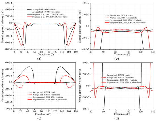 The cross-sectional normal approach velocity and its locally magnified plot are shown in Figure 6 for the average load and slow walking cases. The normal approach velocity of the physiological loading case was generally higher than in the constant loading case for both the elastic and viscoelastic models. Under constant loading, the variation in the normal approach velocity of the elastic model was minimal. The normal approach velocity of the viscoelastic model was lower than that of the elastic model at the central position, but higher at the edge of the contact area. Under physiological loading, the normal approach velocity was comparable for the elastic and viscoelastic models at the central position, while at the edge of the contact area, the elastic model displayed a higher normal approach velocity than the viscoelastic model.