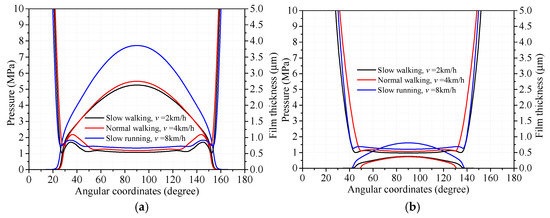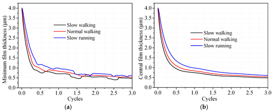 Minimum (a) and central (b) film thickness under different gait patterns.