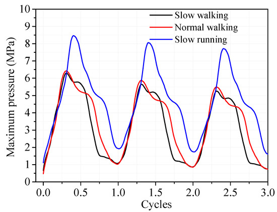 The minimum and central film thicknesses and maximum pressures of the three different physiological gait loads over three cycles are shown in Figure 7 and Figure 8. The minimum and central film thicknesses were largest under the slow running gait, followed by normal walking, and smallest under the slow walking gait. The minimum film thicknesses of slow running were 1.15~1.35 times greater than those of normal walking and 1.33~1.66 times greater than those of slow walking. For example, at time step of 2.31 T, the minimum film thicknesses were 0.684 μm, 0.593 μm and 0.513 μm for the slow running, normal walking and slow walking cases, respectively. At a time step of 3.0 T, the minimum film thicknesses were 0.605 μm, 0.534 μm and 0.485 μm for the slow running, normal walking and slow walking cases, respectively. Due to the similar maximum loads in normal and slow walking conditions, the corresponding maximum pressures at the three loading peaks were approximately 6.30 MPa, 5.65 Mpa, and 5.26 Mpa for both cases. In contrast, the three maximum pressure peaks were significantly higher for the slow running condition, measuring 8.47 Mpa, 8.06 Mpa, and 7.72 Mpa.
