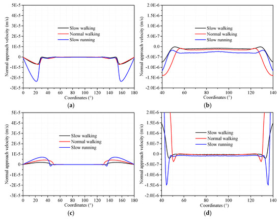 The cross-sectional normal approach velocity and its locally magnified plot at instants of 2.31 T and 3.0 T for the three gait patterns are shown in Figure 10. At the central position of the contact area, the normal approach velocity under the slow running condition was higher than in the normal walking and slow walking cases. The normal approach velocity of the slow walking case was generally similar to that of the normal walking case. At the edge of the contact area, the normal approach velocity of the slow running case was remarkably greater than the other gait patterns.