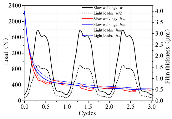 Film thicknesses of the viscoelastic model subjected to slow walking (w) and a lighter load (w/2).