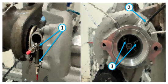 Turbocharger with the applied accelerometers (1), RPM probe (2), and displacement sensors (3).