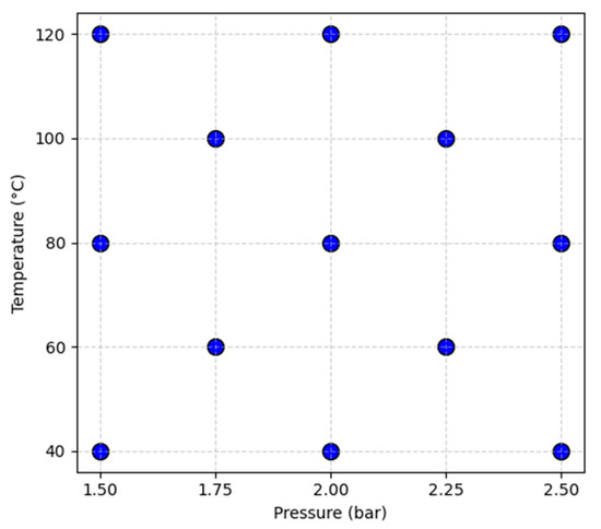 Although a full factorial design with these five levels for both parameters would yield 25 operational points, the extensive sensor data and multiple measurement cycles necessitated a more efficient approach. After evaluating several designs of experiments (DoE) methodologies, a custom fractional factorial design was adopted, as illustrated in Figure 3, which includes four additional points to improve interpolation accuracy.