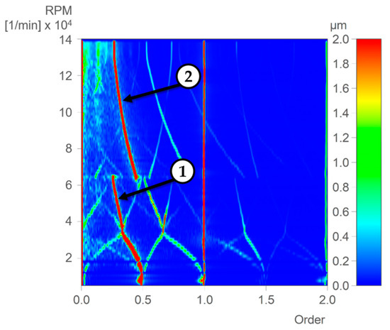 As the first step after segmentation, Figure 6 shows the order spectrum for one run-up phase, calculated from the displacement sensor data, with oil supply conditions set to 40 °C and a pressure of 2.00 bar. This approach enabled the identification of critical bifurcation events, providing reliable insights into the dynamic behavior of the system under varying operating conditions. Figure 5 is depicted only up to the second order, as the focus is on the subsynchronous frequencies. The bifurcation speed is clearly visible at about 65,000 rpm, where the first subsynchronous frequency (Sub 1) transfers into the second (Sub 2). The color scale was optimized to highlight the subsynchronous frequencies in detail. Notably, both subsynchronous components exhibit multiple modulations at higher order numbers, emphasizing the significance of this phenomenon in understanding the system’s dynamics.