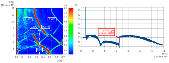 To determine the bifurcation speed points and eliminate the need for manual identification in the order spectrum, a custom-designed order tracking method was applied to the data. This approach focuses on the relevant order range, with displacement magnitudes plotted in a 2D diagram as a function of rotational speed. Figure 7 illustrates the process and the resulting two-dimensional visualization. The 0.35 order was chosen as the center point, with a 100% order width considered. This means the range from 0.35/2 order left and right from the 0.35 order was analyzed and depicted on the 2D diagram. The result on the right-hand side clearly reveals the bifurcation point, making it easily identifiable.