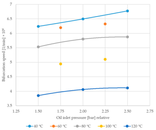 Bifurcation speed in the function of oil supply pressure for various oil supply temperatures: experimental data points and second-order polynomial trend lines.