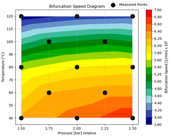 Figure 10 summarizes the data from Figure 8 and Figure 9, presenting a three-dimensional shell diagram that integrates measured values, as indicated by the white points, with linear interpolation applied to provide the continuous surface depicted. The diagram reveals a noticeable trend in which the influence of oil supply pressure diminishes as temperature increases, suggesting that higher temperatures lead to a reduced impact of pressure on bifurcation behavior. This phenomenon could be attributed to the decrease in oil viscosity at elevated temperatures, which in turn lowers the damping and stiffness effects provided by the oil film. This observation is crucial for understanding rotordynamics in the context of turbocharger performance. As oil viscosity decreases with increasing temperature, the oil supply pressure becomes less effective in stabilizing the rotor system. This information is valuable for optimizing operational strategies as it enables better prediction of instability occurrences across the full range of operating conditions. Furthermore, incorporating these parameter dependencies into future rotordynamic simulations will enhance the accuracy of bearing stiffness and damping calculations. Such improvements could lead to more precise models for rotor behavior, particularly under varying thermal conditions. By advancing the understanding of how oil temperature and pressure influence the rotor bearings, engineers can refine their designs to mitigate instability and improve the reliability of turbochargers in automotive applications. Additionally, future investigations can leverage this data to examine other dynamic aspects of rotor systems, such as transient behavior and response under extreme operating conditions.