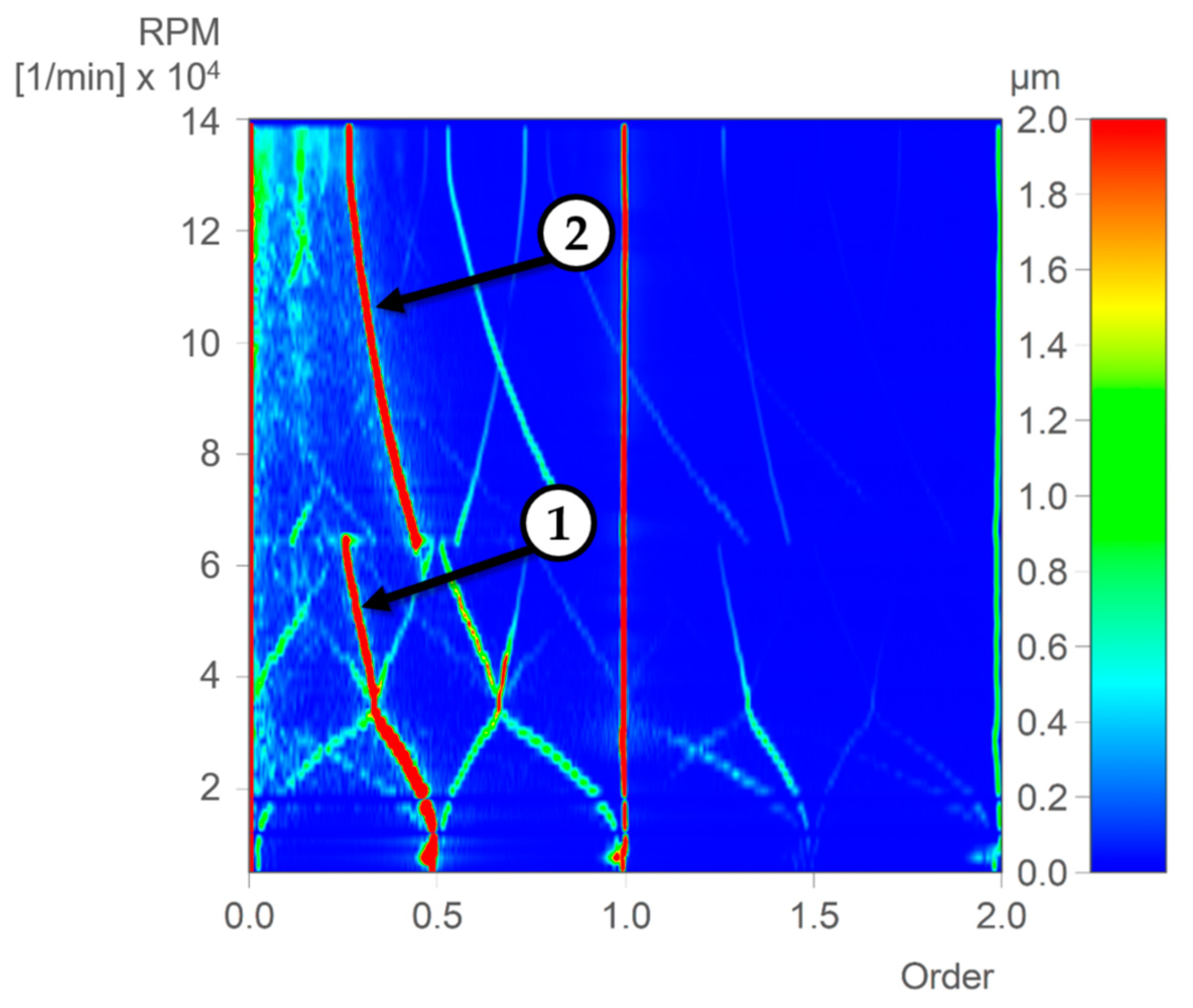 Figure 6 shows the order spectrum for one run-up phase, calculated from the displacement sensor data, with oil supply conditions set to 40 °C and a pressure of 2.00 bar. This approach enabled the identification of critical bifurcation events, providing reliable insights into the dynamic behavior of the system under varying operating conditions.