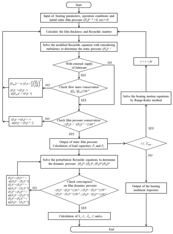 After obtaining the static pressure distribution of the fluid film, the perturbation Reynolds equations (Equation (12)) are solved to obtain the partial derivatives of pressure P. Then, Equations (13)–(17) are solved to determine the dynamic coefficients, equivalent stiffness coefficient, whirl-frequency ratio, and threshold speed. Concurrently, the motion equations of the journal bearing (Equation (18)) are solved through the Runge–Kutta method utilizing the acquired force and motion parameters. This iterative process continues with updates on motion and forces until reaching a terminal time Tmax, resulting in a nonlinear trajectory.