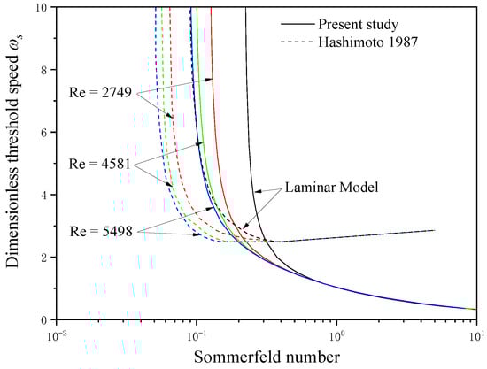 Figure 3 shows the variation of dimensionless threshold speed with Sommerfeld number, as calculated by the laminar flow model and turbulence model. As can be seen, the threshold speeds ωs decrease with an increase in the Sommerfeld number. Under small Sommerfeld number conditions, ωs decreases with an increase in the Reynolds number. In contrast, at large Sommerfeld number conditions, the turbulence does not affect the value of ωs. The values of ωs calculated in this paper are larger than those in the literature under small Sommerfeld number conditions, while the opposite relationship is observed under larger Sommerfeld number conditions. This may be because the results in the literature are analytical solutions based on short bearing theory, whereas the results of this paper are numerical solutions using the finite element method. Differences in the calculation method contribute to differences in the results.