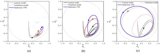 The trajectories of the bearing are calculated at the rotation speeds of 3000 rpm, 5000 rpm, and 6000 rpm. The corresponding Reynolds numbers are 2749, 4581, and 5498, respectively. At these specified rotation speeds, the bearing operates in distinct lubrication states: laminar, transitional, and turbulence. The rotor mass and unbalanced eccentricity used in the calculation are 2.65 kg and 2.5 × 10−5 m, respectively. Figure 4 shows the numerical nonlinear trajectories obtained in this paper and the experimental results presented in the literature [27]. As can be seen in Figure 4a, convergent trajectories are observed regardless of whether the turbulence effect is taken into account at a rotation speed of 3000 rpm, while the experimental trajectory manifests as a small elliptical orbit. Despite discrepancies between theoretical and experimental equilibrium positions, the results clearly indicate that the journal can operate stably at this rotational speed. In Figure 4b, the trajectory calculated using the laminar model gradually approaches the equilibrium position at a rotation speed of 5000 rpm, indicating that the journal can operate stably. In contrast, the trajectory derived from the turbulence model exhibits a significantly larger elliptical orbit, which aligns more closely with experimental results. As the rotation speed increases to 6000 rpm, the measured journal trajectory attains a limit cycle, indicating that the journal becomes unstable, as shown in Figure 4c. In comparison to the trajectory predicted by the laminar model, the numerical results obtained from the turbulence model exhibit greater consistency with experimental data. Through a thorough examination of both theoretical and experimental outcomes, it can be concluded that utilizing the laminar model in the analysis may lead to an underestimation of bearing stability.