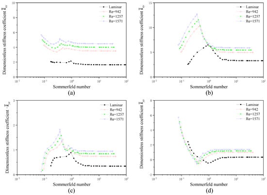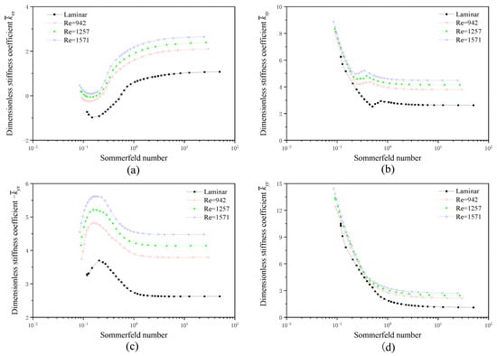 Figure 12 shows the variation of stiffness coefficients of TSRB with Sommerfeld number. With the increment of the Sommerfeld number, the direct stiffness coefficient first decreases and then increases, as shown in Figure 12a. While the cross-coupled stiffness exhibits an opposite trend, it first increases and then decreases with an increasing Sommerfeld number, as shown in Figure 12c. As for the direct stiffness coefficient and the cross-coupled stiffness , a consistent decrease is observed with an increasing Sommerfeld number, as shown in Figure 12b,d. In addition, all four stiffness coefficients increase with the Reynolds number.