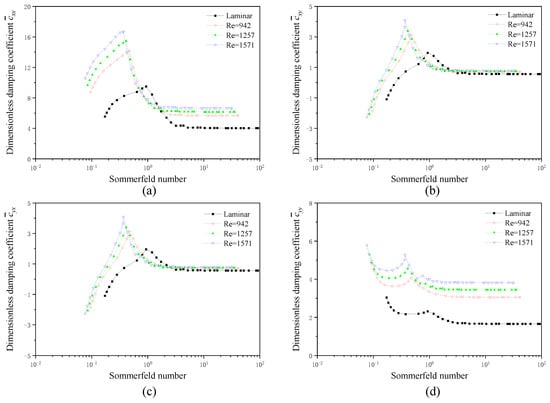 Figure 6 shows the variation of damping coefficients of TLB with Sommerfeld number. The direct damping coefficient , the cross-coupled damping coefficients and show the same variation trend. With the increment of the Sommerfeld number, , , and first increase and then decrease. While the direct damping coefficient shows complex variation with the Sommerfeld number, it first decreases, then increases, and finally decreases to a stable value. In addition, the calculated using the turbulence model have larger values than those calculated by the laminar model in various Sommerfeld numbers. The values of , , and increase with the Reynolds number when S < 0.7 and decrease with the Reynolds number when S > 2.