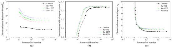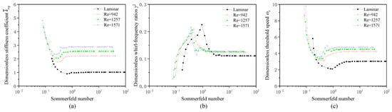 The analysis presented above indicates that when S > 2, the stiffness and damping coefficients change little with the Sommerfeld number. As for the influence of turbulence, the stiffness coefficients and direct damping coefficients increase with the Reynolds number. Consequently, the equivalent stiffness coefficient and whirl-frequency ratio γ2 both increase with the Reynolds number, as shown in Figure 14a,b. Generally, an increase in signifies enhanced stability, whereas a rise in γ2 suggests diminished stability. Under the combined influence of these two mechanisms, it can be noted that for S < 0.1, the threshold speed ωs decreases with increasing the Reynolds number; conversely, for S > 0.1, ωs increases with increasing the Reynolds number, as shown in Figure 14c.