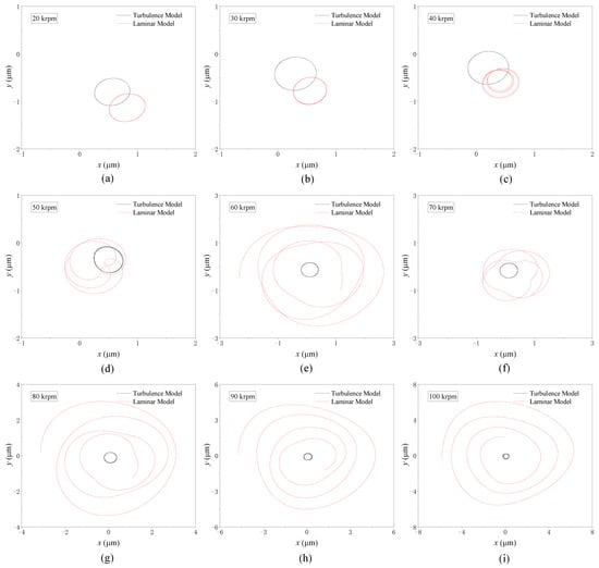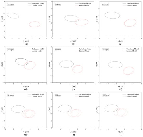 Figure 8 shows the nonlinear trajectories of TLB at various rotation speeds ranging from 20 krpm to 100 krpm. In the calculation, the rotor mass and unbalanced eccentricity in the calculation are 1.0 kg and 1.0 × 10−6 m, respectively. The corresponding Sommerfeld numbers vary from 0.98 at 20 krpm to 4.92 at 100 krpm. As can be seen, the trajectories calculated using the turbulence model consistently exhibit elliptical shapes across the entire speed range. Conversely, the trajectory calculated using the laminar model varies with changes in rotation speed. When the rotation speed is below 50 krpm, elliptical trajectories are observed, as shown in Figure 8a–c. However, once the rotation speed exceeds 50 krpm, sub-synchronous whirling motion occurs, resulting in heart-shaped patterns, as shown in Figure 8d–i.