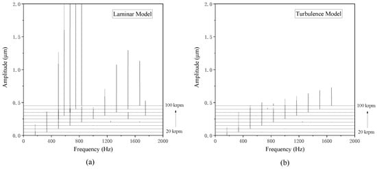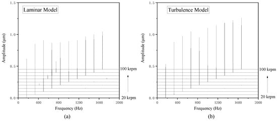 Figure 15 and Figure 16 show the nonlinear trajectories and the waterfall plots of TSRB at different rotation speeds ranging from 20 krpm to 100 krpm. The rotor mass and unbalanced eccentricity used in the calculation are the same as those employed for the TLB, which are set at 1.0 kg and 1.0 × 10−6 m, respectively. The corresponding Sommerfeld numbers vary from 0.98 at 20 krpm to 4.92 at 100 krpm. When the rotation speed does not exceed 30 krpm, the trajectories calculated using turbulence and laminar models both exhibit convergence and are approximately circular in shape. Only synchronous components are found in the frequency spectra, as shown in Figure 15a,b and Figure 16.