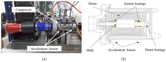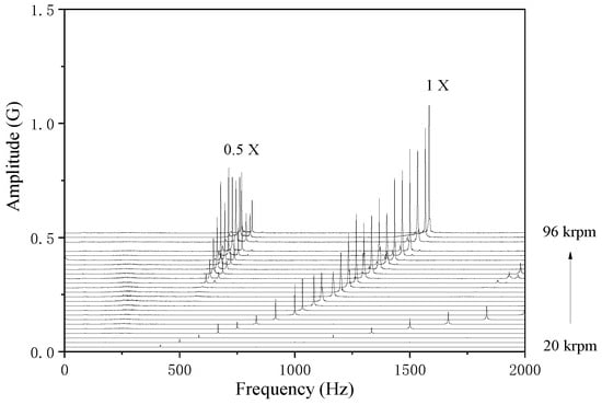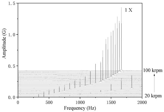 Figure 9 shows the waterfall plots of the bearing trajectories. As can be seen, only synchronous components are observed in the waterfalls obtained by the turbulence model. In contrast, the sub-synchronous component is observed in the results calculated using the laminar model when the rotation speed reaches 50 krpm, with its amplitude increasing with the increment of rotation speed. For validation purposes, the experimental setup and results from a previous study [8] are presented in Figure 10 and Figure 11, where no sub-synchronous component is found in the waterfall plots of the bearing vibration. The results calculated using the turbulence model are in better agreement with the experimental data.