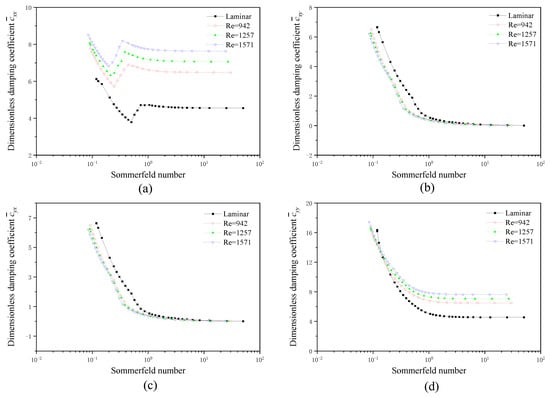 Damping coefficients of TLB versus Sommerfeld number: (a) ; (b) ; (c) ; (d) .