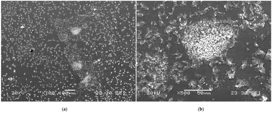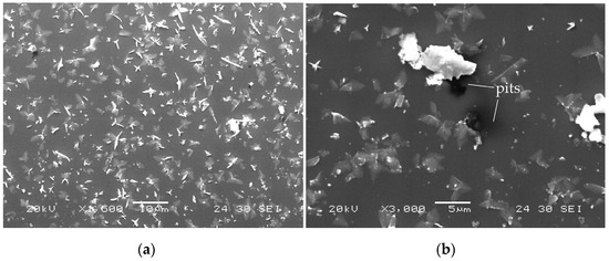 (a,b) Surface morphologies of taC thin film with a substrate pulse bias of 1000 V observed at different magnifications after potentiodynamic polarization measurement in a 5 × 10−2 M HgCl2 solution.