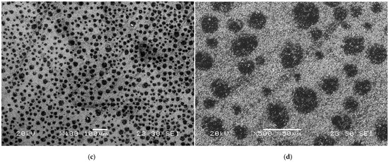 Surface morphologies of N-taC thin film, produced on Si substrate via FCVA deposition process with an N2 flow rate of 20 sccm, observed at different magnifications after a linear sweep anodic stripping voltammetric (LSASV) test in a 1 × 10−2 M Hg2+ + 0.1 M NaCl solution was continuously repeated (a,b) 7 times and (c,d) 30 times. The LSASV test consisted of two main steps: reducing Hg2+ ions from the solution onto the film surface by applying a negative deposition potential of −1.2 V vs. a standard saturated calomel reference electrode (SCE) for 120 s and stripping reduced Hg atoms from the film surface into the solution by the application of a potential scan from −0.7 to 0.1 V vs. SCE at a scan rate of 36.36 mV/s. The pH of the solution was adjusted to “6” by HCl (HCl → H+ + Cl−).