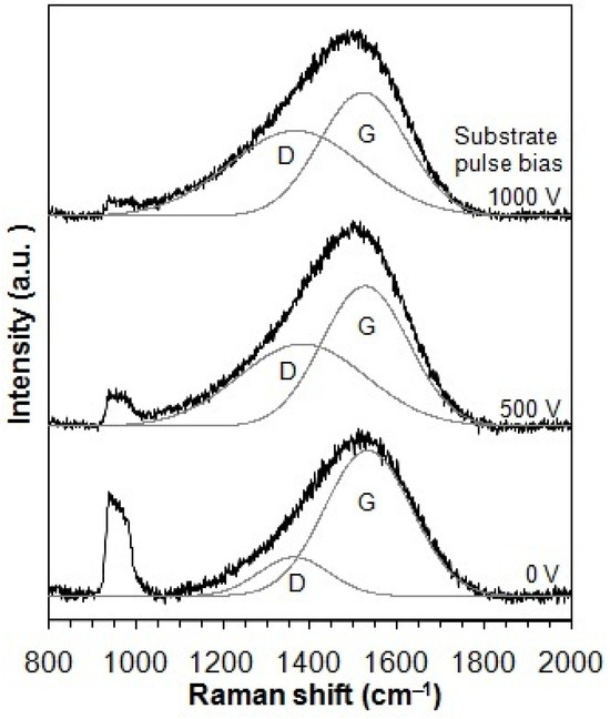 In Figure 3b, increasing the substrate pulse bias from 0 to 1000 V decreases the FWHMG of the taC thin films from 243.1 cm−1 to 220.5 cm−1. Since the FWHMG is an indication of the disorder of sp2 bonds, the decreased FWHMG of the taC thin films can be interpreted as the decreased disorder of sp2 bonds in their C matrixes [3,38]. However, the increased FWHMD of the taC thin films from 355.4 cm−1 to 385.6 cm−1 with an increased substrate pulse bias from 0 to 1000 V can be related to the increased disorder of rings in their C matrixes. The reason is that increasing the number of rings in the presence of the large number of sp3 bonds increases their disorder in the amorphous carbon structures of the taC thin films, which in turn weakens bonds and thereby lowers the vibrational density of states to cause the D peak position to shift downwards (Figure 3a) and the FWHMD to shift upwards (Figure 3b) [3,37].