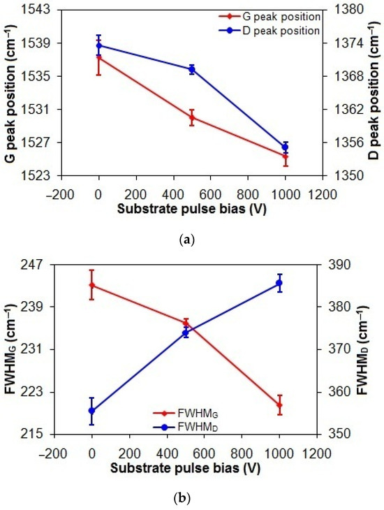 As shown in Figure 3a, the G and D peak positions of the taC thin films exhibit a progressive shift from 1537.2 cm−1 and 1373.6 cm−1 to 1525.3 cm−1 and 1355.1 cm−1, respectively, with an increasing substrate pulse bias from 0 V to 1000 V. This can be explained by the changes in sp2 bonding configuration from short chains to rings with their decreased sp3 content associated with their increased graphitization, thanks to the longer bond length of rings than that of chains for lower vibrational frequency [3,37].