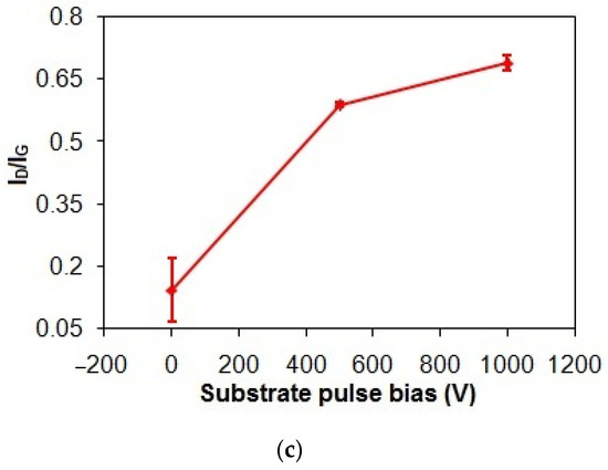 In Figure 3c, the ID/IG of the taC thin films apparently increases from 0.14 to 0.7 (5 times higher) with an increased substrate pulse bias from 0 to 1000 V, indicating enhanced graphitization [3,37]. During the film deposition, the energetic bombardment of C species generates heat and dissipates it within the growing film, causing the graphitization of the film [3,39]. As a result, the increased substrate pulse bias results in the increased kinetic energies of C species and, thereby, the increased graphitization of the taC thin films for their increased ID/IG.