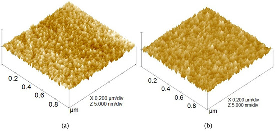 The atomic force microscopy (AFM) (Veeco Digital Instruments, S-3000, Plainview, NY, USA) with a Si3N4 tip in tapping mode was carried out to capture five surface topographies of the taC thin film in a scan area of 1 µm × 1 µm for each substrate pulse bias, from which their averaged surface roughness values, such as arithmetic mean roughness (Ra), root-mean-square roughness (Rq), average maximum peak height (Rpm), and average maximum valley depth (Rvm), were taken.