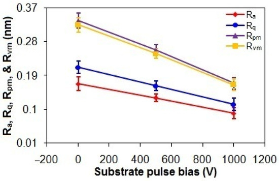 As shown in Figure 5, the Ra and Rq values of the ta-C thin films progressively decrease from 0.17 nm and 0.21 nm to 0.09 nm and 0.11 nm, respectively, with an increasing substrate pulse bias from 0 to 1000 V. While higher graphitization in carbon-based films is typically correlated to elevated surface roughness due to reduced film density from increased sp2 content [3,40], the observed reduction in roughness with higher substrate pulse bias contradicts this conventional expectation. This suggests that graphitization-induced morphological effects are secondary to deposition kinetics in this system. Specifically, the energetic bombardment of C species during deposition flattens the surface, effectively counteracting roughness-induced graphitization effects [3,41]. This is also supported by the reductions in the Rpm and Rvm values from 0.34 nm and 0.32 nm to 0.17 nm and 0.16 nm, respectively, with an increased substrate pulse bias from 0 V to 1000 V [41].