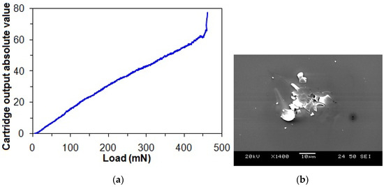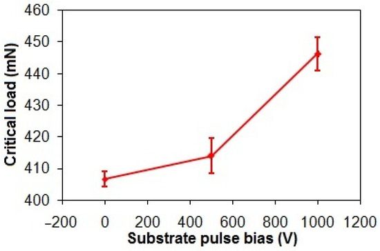 Figure 6a shows the representative progressive loading curve of the taC thin film with a substrate pulse bias of 1000 V, in which a critical load is taken from an abrupt change in the output signal, which is associated with an instant adhesive failure between the film and substrate. Therefore, the critical load is taken as a measure of film adhesion strength. There is no observation of any apparent changes in the trend of output signal versus load before the critical load (Figure 6a), and an observation of a microcrack only at the critical load implies that the cohesive strength of the taC thin film is strong enough to withstand scratch-induced damage until its adhesive failure occurs at the critical load.