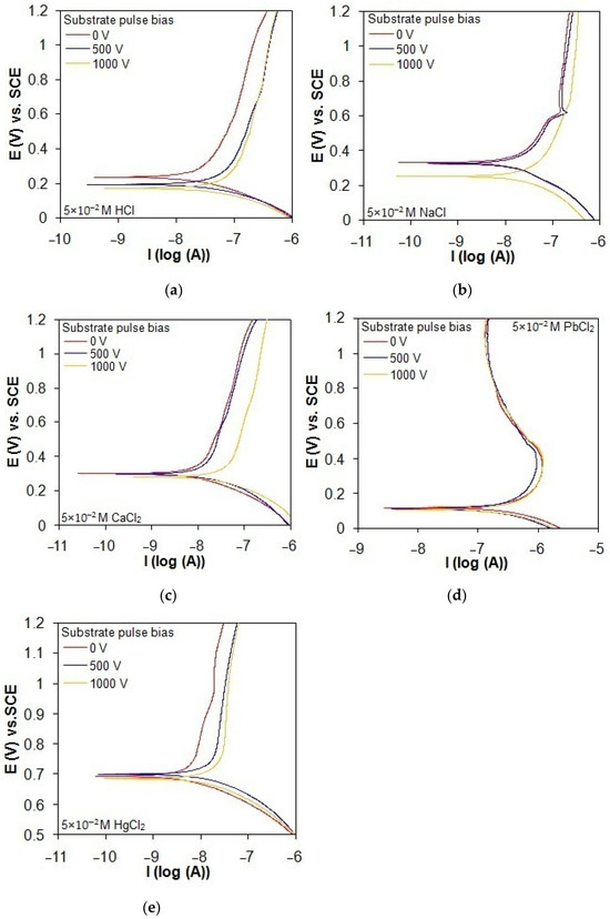 Potentiodynamic polarization curves of taC thin films with different substrate pulse biases measured in (a) 5 × 10−2 M HCl solution, (b) 5 × 10−2 M NaCl solution, (c) 5 × 10−2 M CaCl2 solution, (d) 5 × 10−2 M PbCl2 solution, and (e) 5 × 10−2 M HgCl2 solution at a scan rate of 0.8 mV/s.